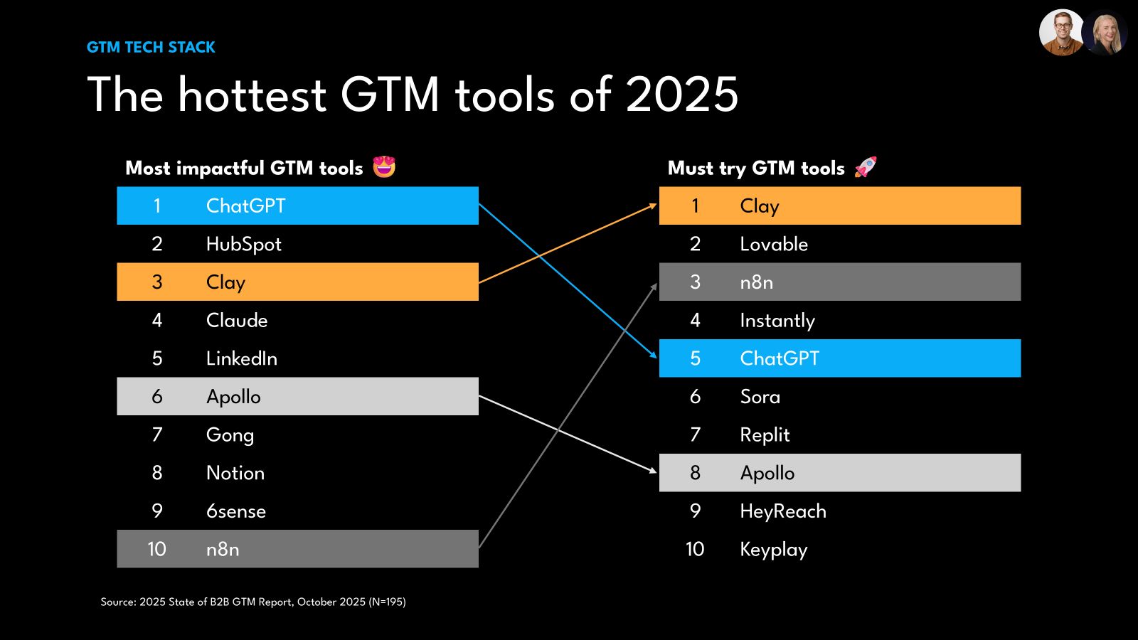 The new GTM tech stack is mostly ChatGPT? There’s been a proliferation of next-gen GTM tools. Only one, ChatGPT, is having a breakout impact. The potential next winners: Clay, Lovable, and n8n.