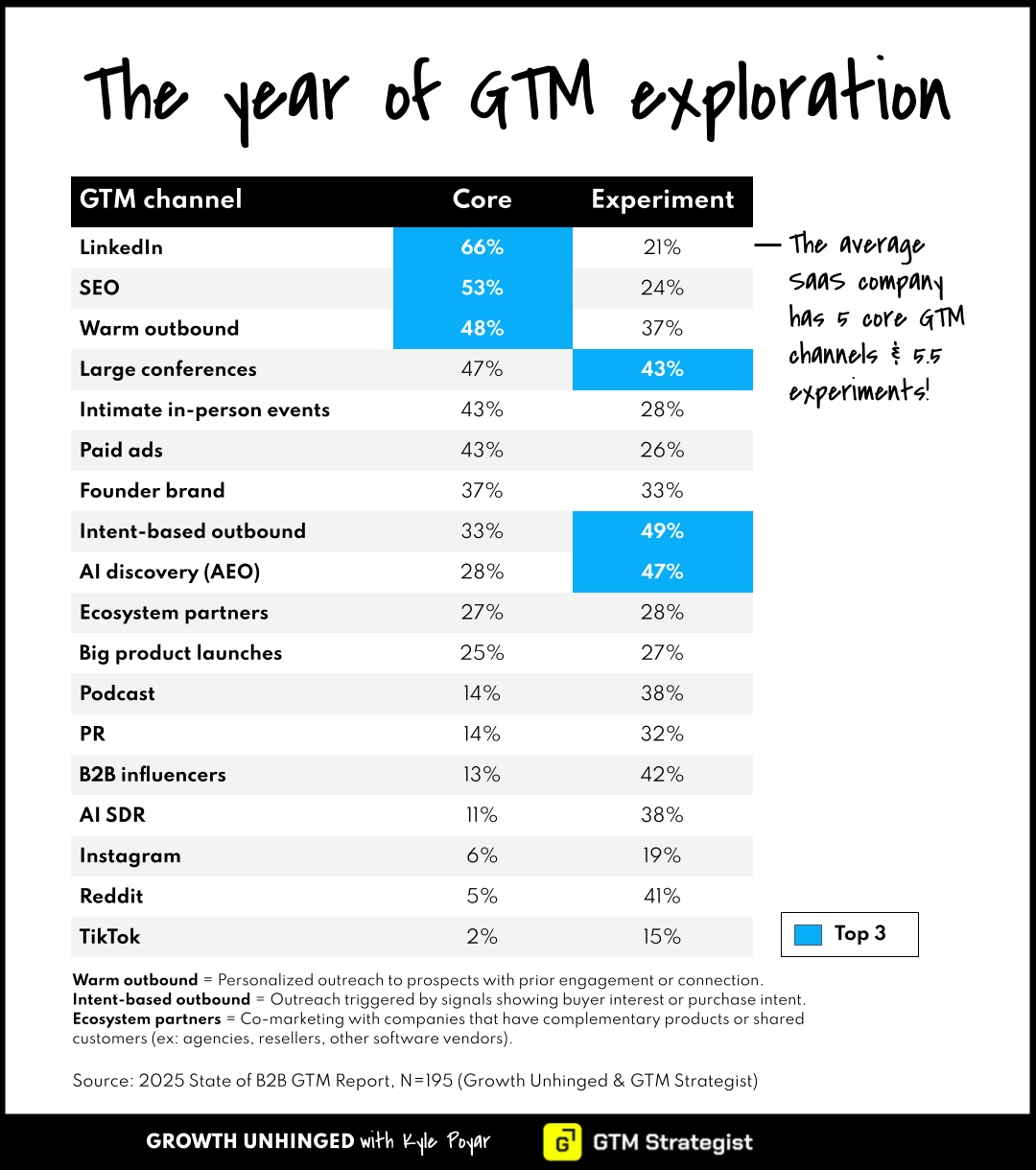 The most common GTM channels were LinkedIn (66%), SEO (53%), and warm outbound (48%). The most common channel experiments were intent-based outbound (49%), AI discovery aka AEO (47%), and large conferences (43%).