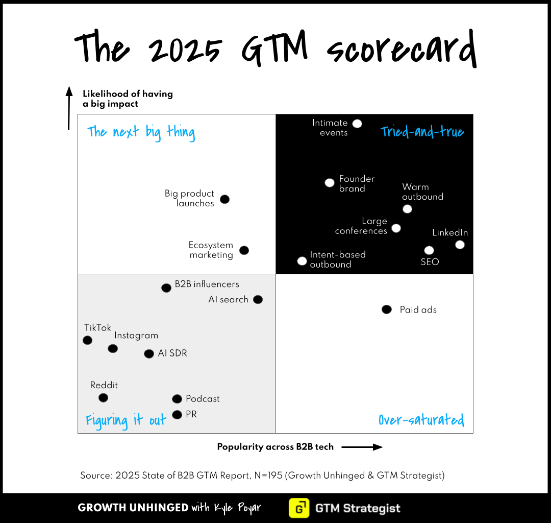 The inaugural 2025 GTM scorecard can help prioritize where to place your bets. We mapped how popular different GTM channels are (horizontal axis) versus how likely they are to be seen as impactful among adopters (vertical axis). The shorthand for interpreting this two-by-two: