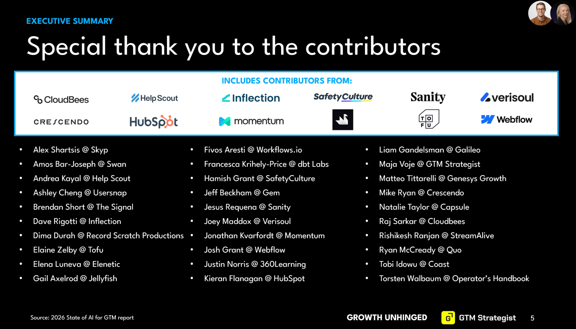 Before we dive into the examples, I wanted to say a special thank you to the 30 GTM leaders who contributed their best AI for GTM workflows. You may recognize some of these names from past newsletter editions. More than half of the contributors (and the AI workflows) are brand new for this report.
