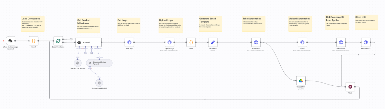 This is built via n8n (see the workflow diagram below) with OpenAI and company information from Apollo.
