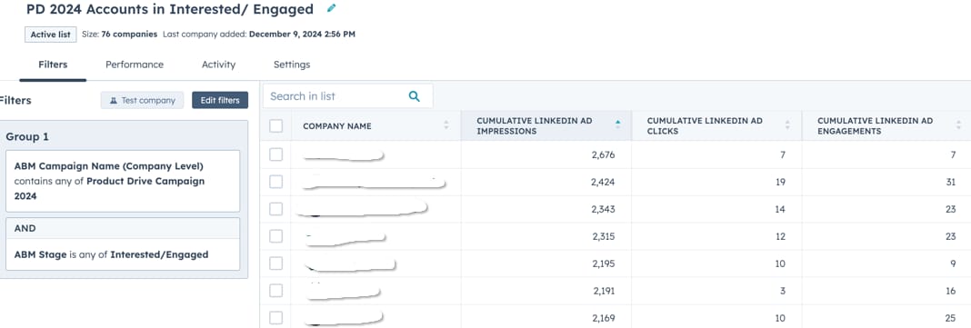 We then created active accounts lists in HubSpot with list membership based on being in a specific ABM stage and the thresholds of “cumulative LinkedIn Ad Engagement/ Clicks”. We have a separate list for each stage of each campaign: