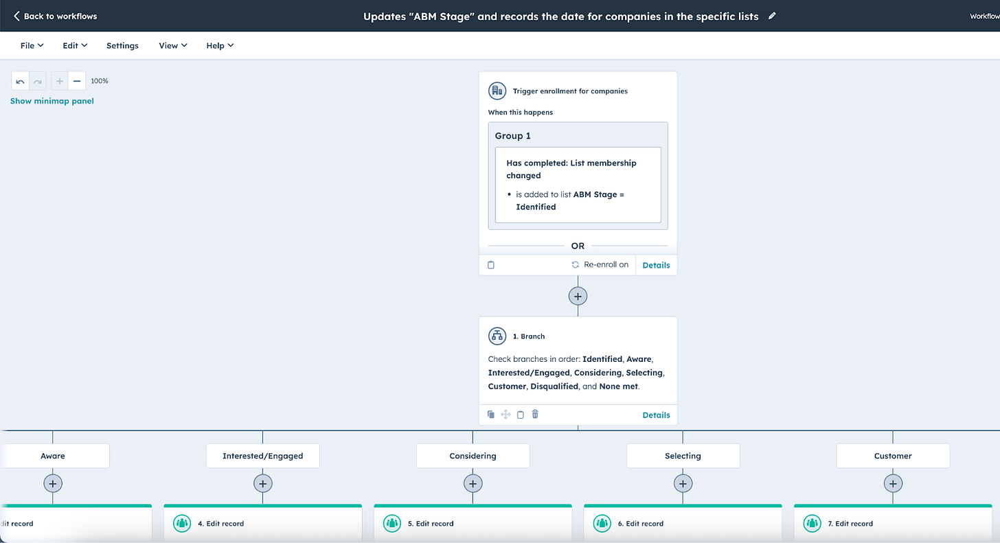 Using list membership and a workflow, we update the “ABM stage” company property:
