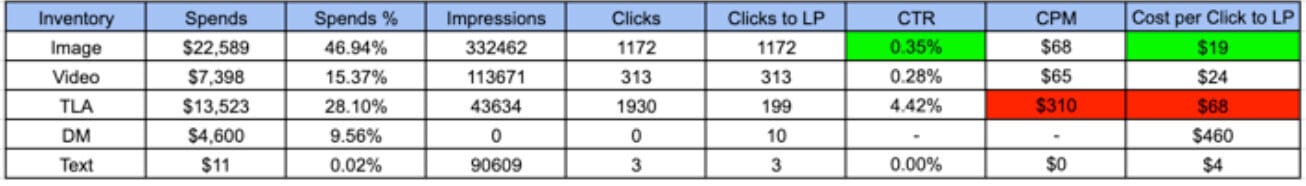 In terms of inventory performance, the single image ads had the highest CTR and the lowest cost-per-click to landing page. This was followed by video ads and thought leader ads. The DM ads so far have been extremely expensive in terms of cost per conversion.