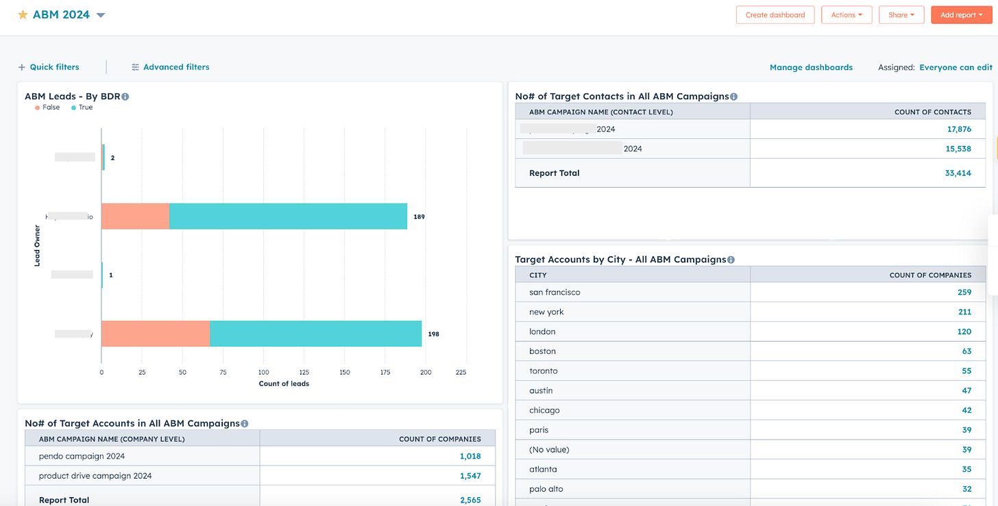 We monitor the metrics, as well as which accounts have progressed to which stage of the ABM campaign (every week and cumulatively) and how much pipeline each account has generated on HubSpot dashboards. There’s one for each campaign, with more granular reports, and one for all currently running campaigns. We also monitor the number of leads sequenced by the BDRs every week.