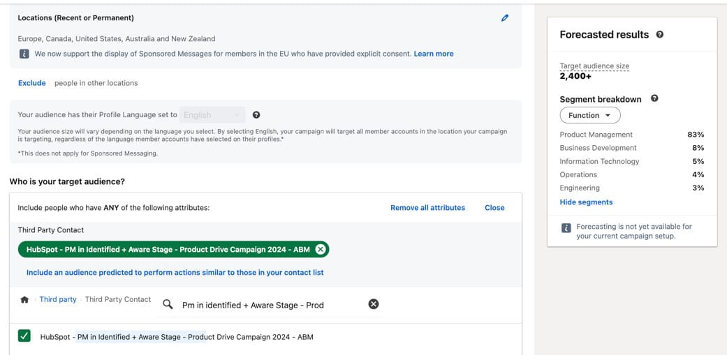 It usually takes around 48 hours for your audience to get ready on LinkedIn after being synced. Once available, you can use these lists with LinkedIn targeting options and add additional filters to further narrow down your audience for more precise targeting.