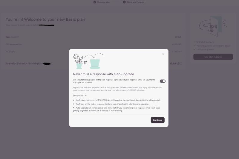 It was transparent. In a small amount of copy, Typeform told me exactly how much more I'd pay, when I'd pay it, when it would be billed, and how I could downgrade. (Once an upgrade happens, it stays on unless you proactively turn it off.)