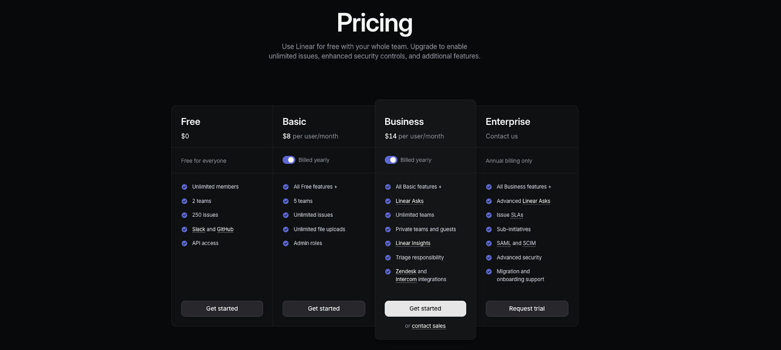 <goal> Please put together an in-depth analysis of Linear's pricing page (http://linear.app/pricing), critiquing its effectiveness and highlighting where 1) it adheres to industry best practices, 2) it stands out via innovative ideas and 3) where it falls short. </goal>