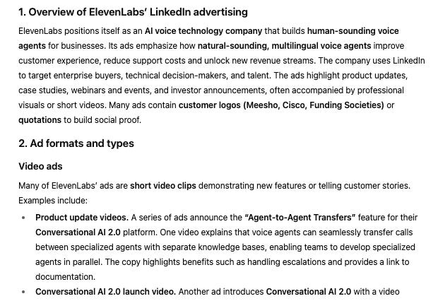 The good news: You can see all ads that competitors ran, including private message ads, in an ad library (LinkedIn / Google / Meta). And the even better news: Instead of sifting through all of this information manually for days, you can just let AI do the heavy lifting.