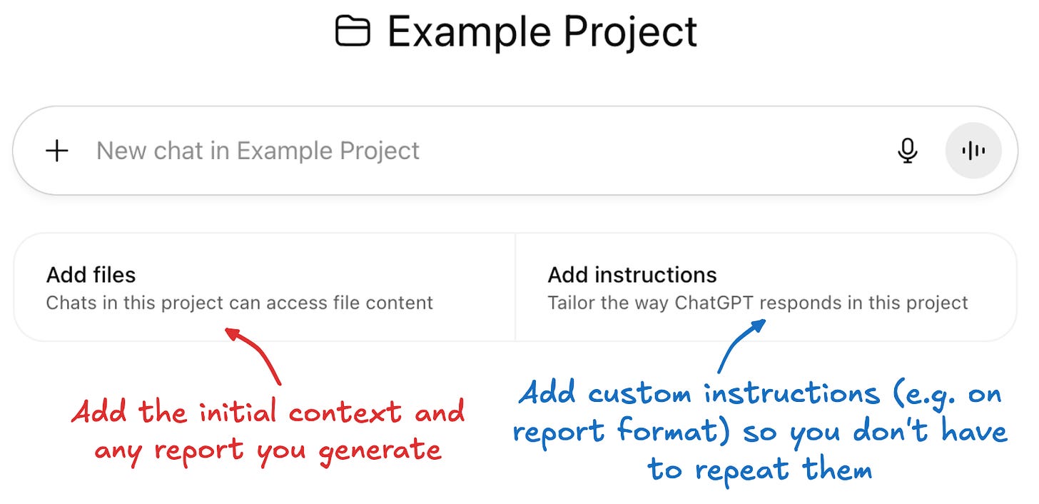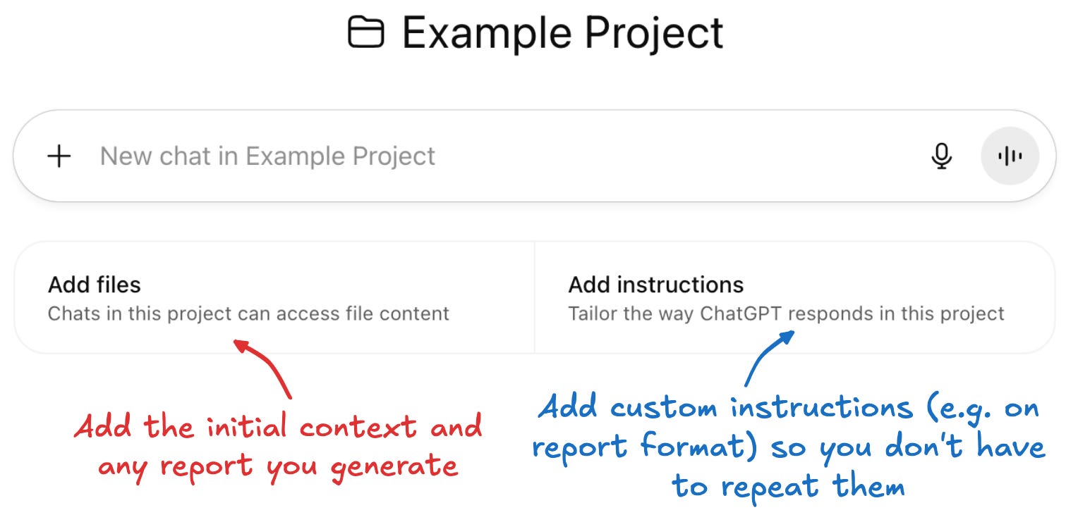 Pro tip: If you don’t want to provide context every time you prompt Deep Research, create a Project. That way, you only need to upload the initial context once, and every research report adds to the joint knowledge between you and the AI.