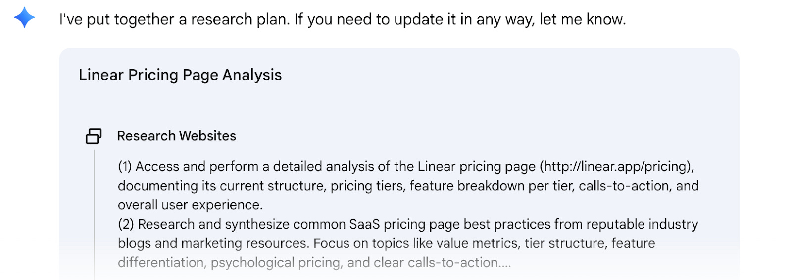 The biggest advantage of Gemini Deep Research is that it always shares a plan before it gets going; that way, you can make adjustments in advance instead of waiting 20 minutes only to find that you disagree with the methodology or the report focuses on the wrong thing.