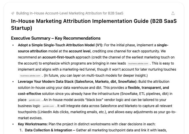 And this is what you’d get back: An end-to-end attribution guide covering different methodologies, implementation approaches, and step-by-step instructions on how to actually do this (including recommendations for UTM tagging conventions, mock SQL code for dbt models etc.):