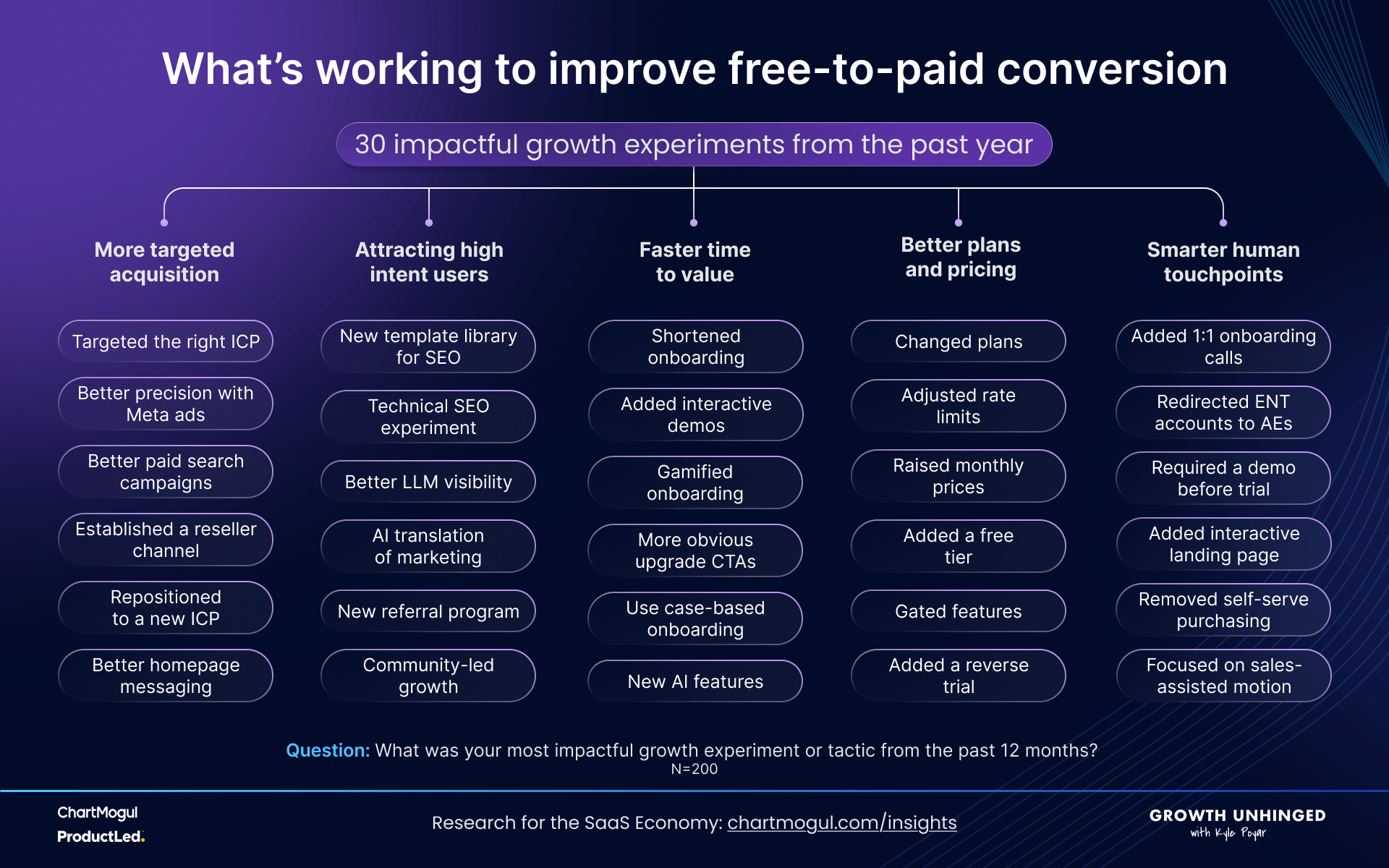 Pricing and packaging had the highest number of mentions when survey participants submitted their most impactful growth experiment from the past year. Perhaps no surprise here.