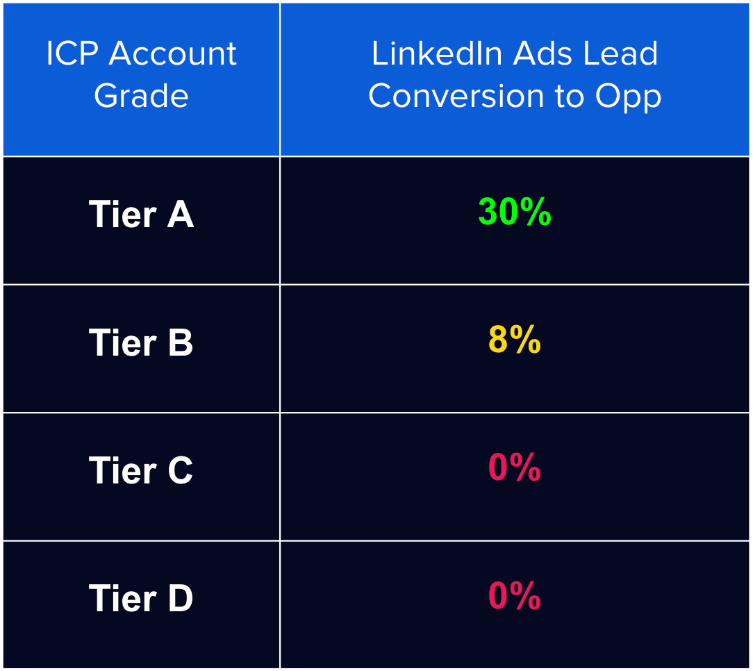 When looking at Mutiny’s LinkedIn ads, the new ICP account grades jumped off the page. The new Tier A accounts saw a 30% conversion from lead to opportunity. Tier B accounts had an 8% conversion. For Tiers C and D, the conversion was a rounding error.