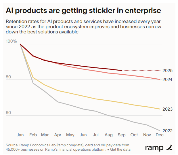 There was some positive news in the Ramp report: AI products are getting much stickier. Ramp’s data shows that the annualized retention of AI products was about 60% in 2023. It’s on track to exceed 80% in 2025.