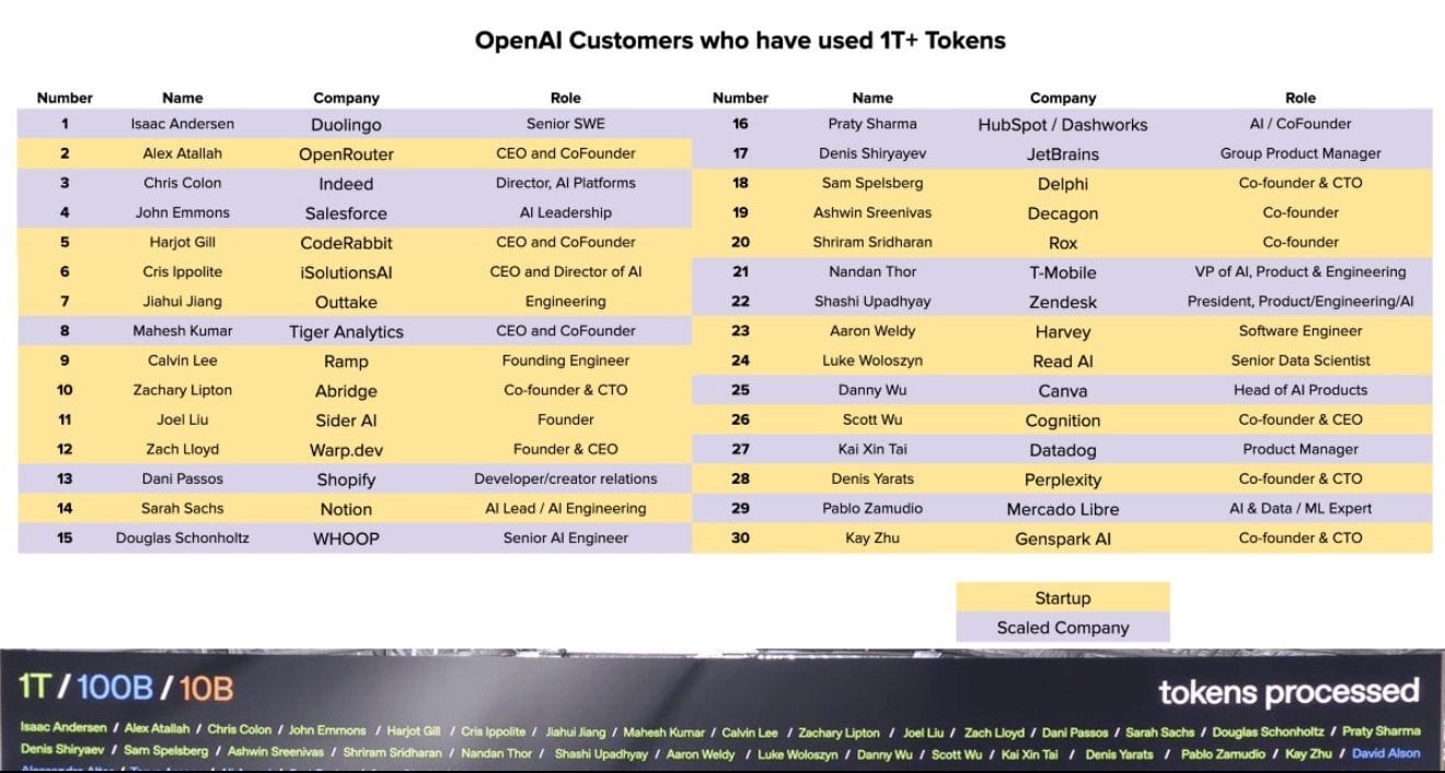 And now we know exactly who is spending all this money. OpenAI recently revealed a list of its top 30 customers who’ve used more than one trillion tokens each. As CJ put it, “Imagine getting called into your CFOs office to explain how you ended up on this list.”