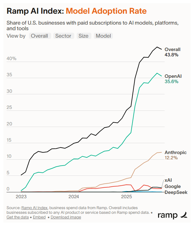 The team at has an epic dataset on startup and SMB spending. They shared a new Ramp AI Index that showed paid AI adoption actually declined in September. This was the second spending decline they’ve seen in 2025. You can see it for yourself in the chart below.