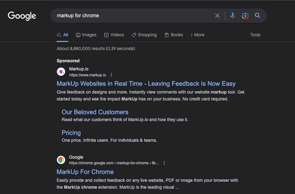 For example, when we started out, every keyword research tool suggested that the term “markup in Chrome” had virtually no search volume. But we know from our user interviews that they were actively searching for a solution, so we decided to bet on these terms. Now, when searching for MarkUp for Chrome, at the top of the search results, you’ll likely see one of our ads, but right after that is a snippet showcasing our MarkUp Chrome Extension.