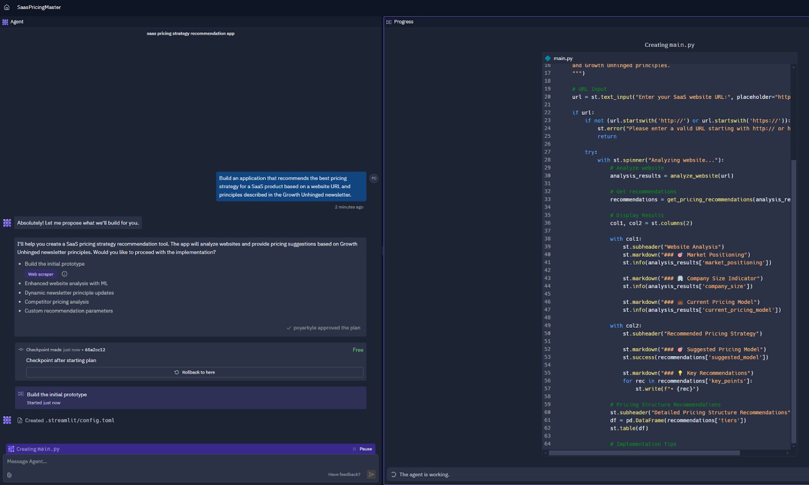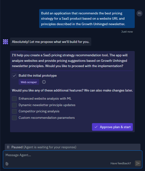 When the initial prototype was built, Agent pinged me to test it. It specifically asked, “Can you see the Pricing Strategy Advisor interface with a URL input field? Does the page load correctly with the title and description?”