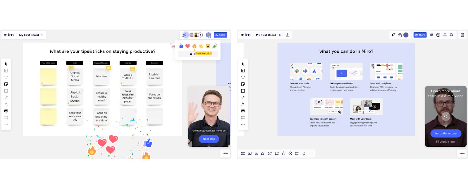 We always try to run qualitative user research in parallel with data analysis. We got additional insights from the user interviews: people didn’t know what they or their teams could do in Miro. We were positioning Miro as a “team-centric” product, which meant that collaboration was the core value on which we needed to deliver. This was the main user problem to solve with a new onboarding experience, and the team came up with a really innovative solution for that: a so-called “robo-collaboration” experience that guides users through the first experience in a human way. The team, leadership, and users were in love with that experience. (Fun fact: We user-tested this flow first with AI-generated videos using Synthesia two years ago, before AI became the new norm!)