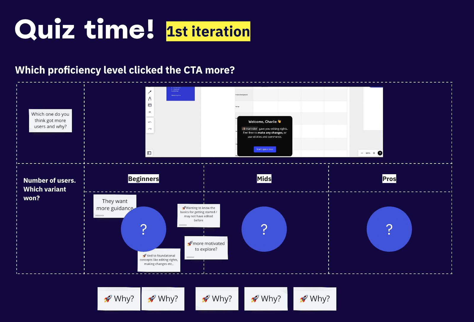 Having spent over six years on Growth teams at Miro, I think the most important and lasting learning I’ve gained is that we need to keep learning and iterate smart. On our Growth Design team, we reflect on each experiment and unpack the WHY behind the result. The “quiz workshop” format helps us uncover further iterations collaboratively — we look at the experiment and try to guess which variation was a winner and the “WHY” behind it, which helps us co-create future solutions with speed.