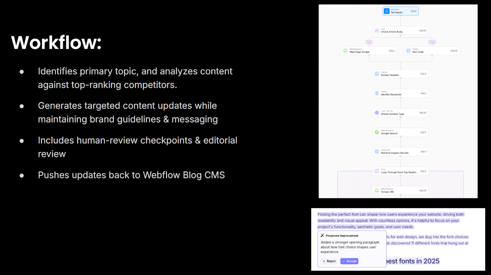 Looked for bottlenecks. Identified which steps slowed the refresh cycle (for Webflow: keyword research, content gap analysis, and CMS ops).