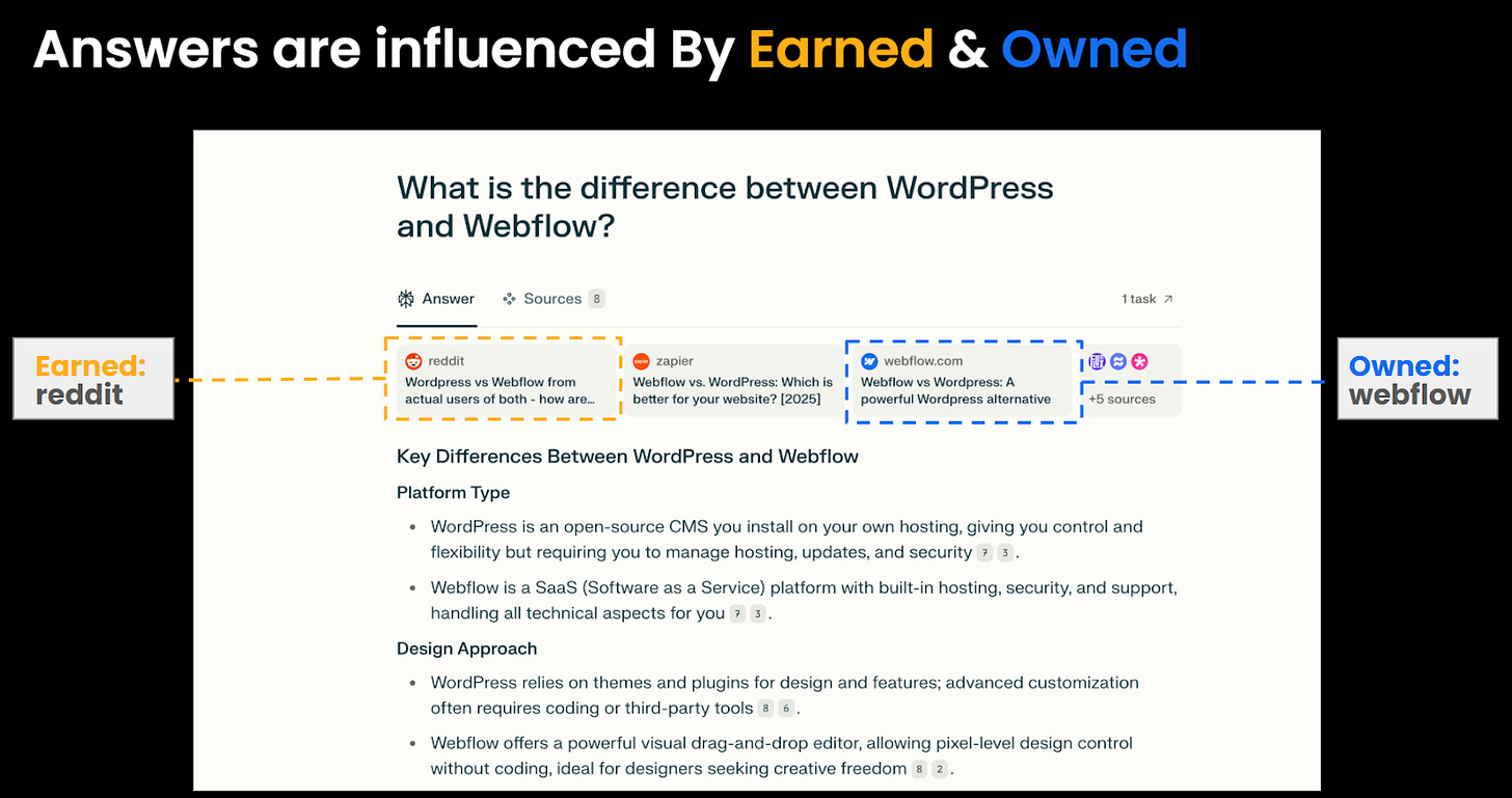 Webflow has made big investments on Reddit across how they show up, how they engage in threads, and how they mine Reddit for insights. “It’s where real user intent and sentiment live, and that’s exactly what LLMs are trained to understand and surface.” What they’re doing: