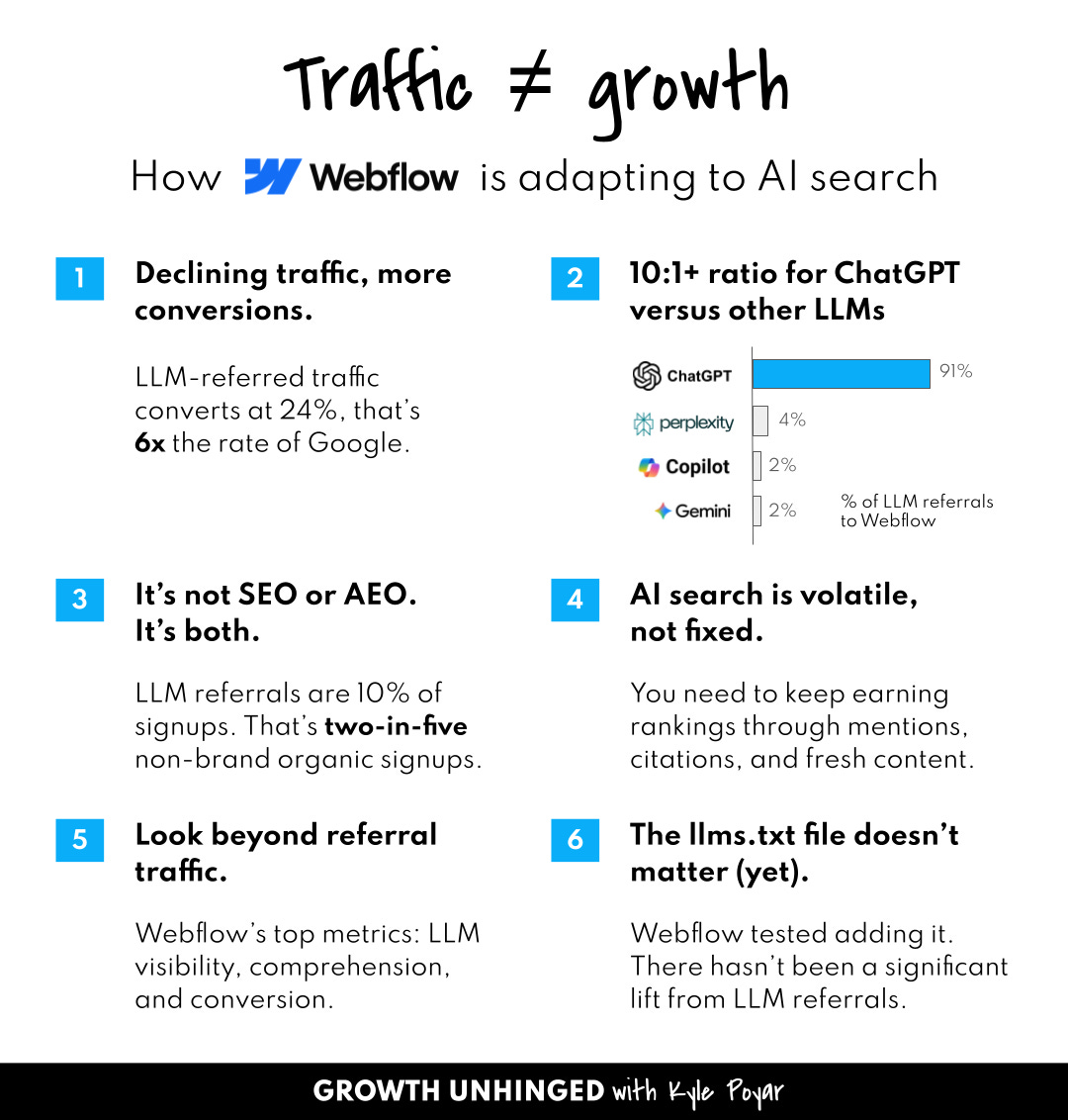 “Google AI overviews are fundamentally changing our traffic between sources,” Josh told me. At the same time, the traffic that’s referred to Webflow from ChatGPT converts at 6x the rate of Google.
