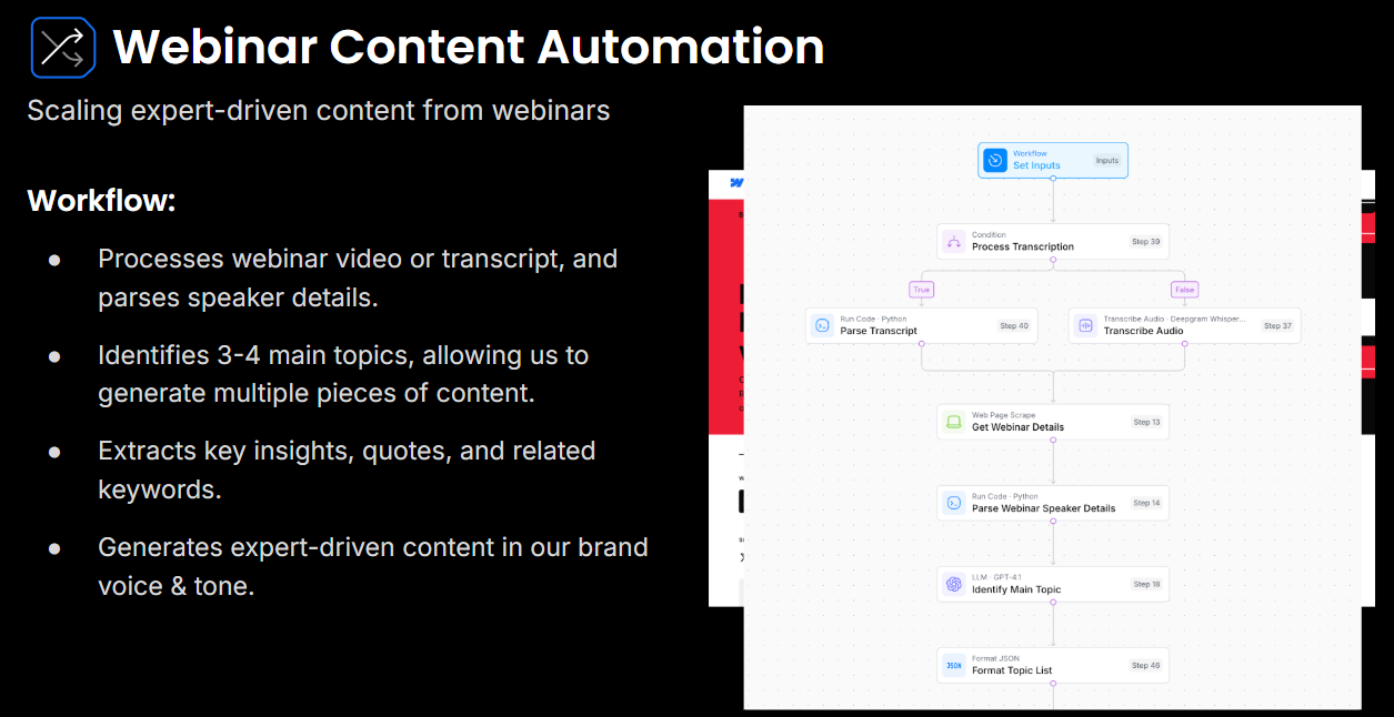 Results: 5-10 content assets per webinar | 80% reduction in post-production time | higher AI visibility around these topics