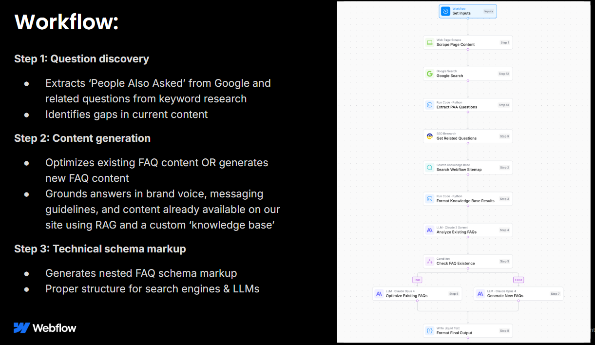 AI reshuffles answers constantly. Refresh velocity can be the difference between staying on top and missing out. This is nearly impossible to do manually or on a one-off project basis. Webflow built an AI-driven workflow to 5x the frequency of their content refreshes.